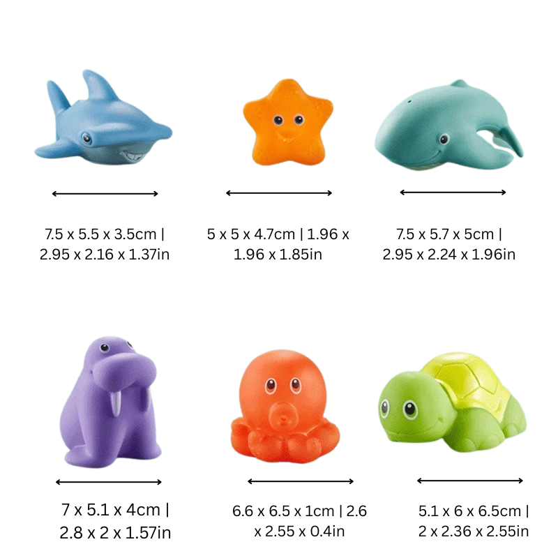 The toys are lightweight and perfectly sized for small hands. Each piece is made from sturdy ABS plastic that stands up to daily play. They’re safe to chew, easy to rinse, and gentle on sensitive skin. Everything dries quickly too—no more moldy bath toys lurking in the corner.